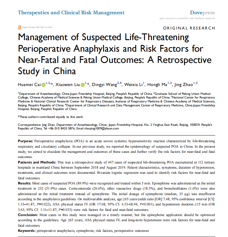 这项研究旨在探讨中国疑似危及生命的围术期过敏反应(POA)的管理和预后情况,并进一步验证导致临近死亡和致死结果的风险因素。研究回顾性分析了中国大陆112家三甲医院在2018年9月至2019年8月期间遇到的447例疑似危及生命的POA病例。研究发现,大多数疑似POA病例(89.9%)在5分钟内得到识别和治疗,但根据过敏反应指南,肾上腺素的初始剂量(中位数为35ug)不足。经过多因素分析,年龄≥65岁、ASA分级IV级和低血压持续时间≥15分钟是临近死亡和致死结果的危险因素。该研究表明,大部分病例得到及时处理,但肾上腺素的应用仍需根据指南进行优化。总的来说,该研究为中国疑似危及生命POA的管理和预后提供了重要信息。通过揭示治疗实践中存在的不足和风险因素,可以帮助改善POA的诊断和治疗。然而,仍需要进一步加强医务人员对POA的管理和认识。此外,该研究还强调了肾上腺素的重要性,并建议根据指南优化其使用。对于高风险患者,特别是年龄较大、ASA分级高和低血压持续时间长的患者,应特别关注POA的预防和管理。这些结果对于改善围手术期过敏反应的诊断和治疗策略以及提高患者安全具有重要意义。(Ther Clin Risk Manag. 2023 May 10;19:383-394.)